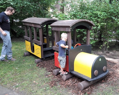 Ein großes Projekt gab es dann doch noch: Bei den Krippies wurden das alte Holzpferd und die Kutsche ausgebuddelt und entfernt und durch eine nagelneue Eisenbahn inklusive Anhänger ersetzt. Ein Großteil der Eisenbahn konnte durch das Bildungsspenderprojekt finanziert werden.