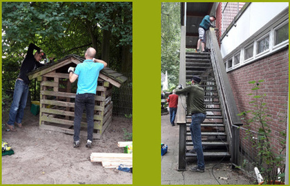 Nachdem im vergangenen Jahr Großes geschaffen wurde, standen zum diesjährigen Schraubertag vermehrt Reparaturen auf dem Plan. So widmeten sich die 25 Erwachsenen tatkräftig dem teilweisen Austausch der Sandkastenumrandung auf dem Hof der Seebären und Löwen sowie der Reparatur des Daches vom Hummel-Spielhaus. Der Handlauf der Löwen-Feuertreppe wurde geschliffen und geölt, der Fallschutz unter den Holzpferden und dem Kletterbaum auf dem großen Hof wurde erneuert, die Pferde wurden geölt, auf den Höfen der Krippen und Hummeln wurde Efeu großflächig entfernt.