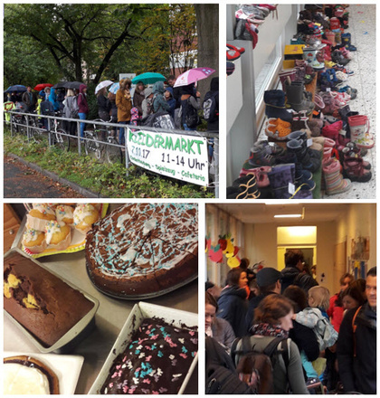Am Vortag hatten etliche Helfer die Räume der Kita hergerichtet; die Tische bogen sich unter der vorsortierten Herbst- und Wintergarderobe sowie unzähligen Büchern und Spielzeugen. Pünktlich um 11 Uhr wurden die Käufer dann am 07.10. eingelassen, die auch das Angebot mit selbst-gebackenem Kuchen und warmen Würstchen in der Caféteria gut annah-men.