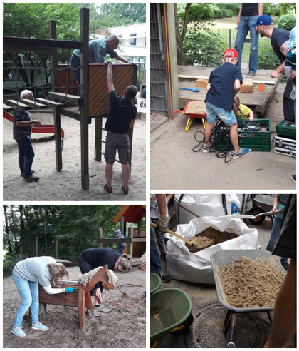 Wie gewohnt wurden unzählige Schubkarren Sand aufgefüllt und der Fallschutz mit neuem Rindenmulch verbessert. Hinzu kam ein Teilabbau des großen Klettergerüstes, Ausbesserungen an der Sandkastenum-randung und dem Podest am Häuschen auf dem großen Hof. Kleine Verschönerungen, wie das erneute Ölen der Pferde und des Geländers der Löwenfeuerschutztreppe sowie das Entfernen von Efeu, wurden ebenfalls in Angriff genommen.