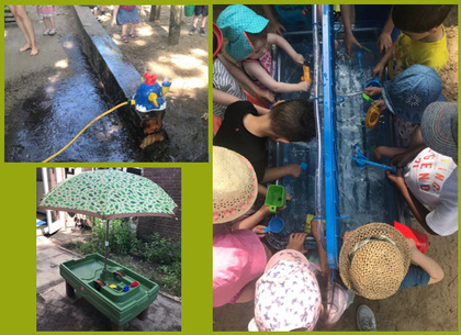 Da der Umbau des großen Hofs sich weiter verzögert, haben wir fünf große Sonnenschirme angeschafft, damit wenigstens etwas mehr Schatten zur Verfügung steht. Außerdem kauften wir Sandspielzeug, Besen, Bälle, Straßenmalkreide, Spielküchenutensilien und ein Dreirad für die Krippe. Und wir schenkten der Kita Rasensprenger für lustige Abkühlung zwischendurch. Weitere Anschaffungen sind in Planung.